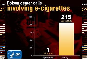 Les CDC font état de 215 appels par mois liés à une exposition toxique à la e-cigarette, de septembre 2010 à février 2014. Plus de la moitié des rapports de cas, soit 51,1% concernent des enfants de moins de 5 ans. Les jeunes d’une vingtaine d’années et les personnes âgées concentrent 42% des cas. Au total, les centres antipoison américains rapportent 2.405 cas d’intoxication liés à l’e-cigarette vs 16.248 liés à la cigarette traditionnelle, sur la même période. Le nombre total de cas d’intoxication est probablement plus élevé, tous les cas n’étant pas signalés aux centres antipoison.