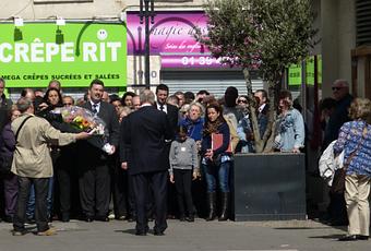 Au sortir d’un conseil municipal exceptionnel du dimanche matin, qui avait pour ordre du jour la baisse des indemnités des élus, Georges Mothron, nouveau maire d’Argenteuil, a prononcé un discours devait le mail des enfants d’Izieu. Il n’était pas possible de s’approcher, et j’ai pris une photo très lointaine.