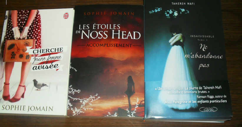 Le mois dernier, j'ai craqué pour "Cherche jeune femme avisée" de Sophie Jomain. Le tome 3 des étoiles de Noss Head est mon achat du trimestre chez France Loisirs.Quant au tome 3 d'Insaisissable, quand je l'ai vu hier au furet du nord, je n'ai pas pu résister car les deux premiers tomes avaient été de gros coups de coeur et j'ai hâte de le commencer.