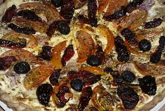 Verser ce mélange. Déposer les tomates finement coupées, les pétales de tomates confites, les olives, un tour de moulin à poivre et enfourner.Four 220°C pendant 30 minutes