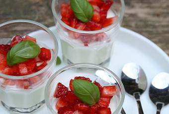 Et, maintenant, voici une recette délicate et raffinée de panna cotta parfumée au basilic et fraises.