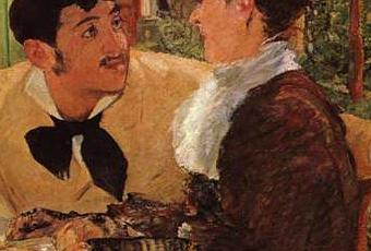 Le tableau de Manet – le seul présent sur les deux qui constituent la richesse de l’endroit – vous scotche littéralement. Un jeune homme s’efforce de convaincre une belle jeune fille. Elle reste crispée, sur le bord de sa chaise. Il lui fait des yeux mouillés … le serveur, une chope à la main, n’en perd pas une miette …