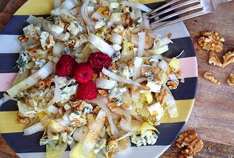 Voici une recette gourmande, fraîche et légère en même temps : la salade d’endives au bleu d’auvergne, noix et vinaigre de framboise.