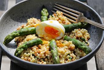 C'est une pâte en forme de petite bille typique de Sardaigne , elle est faite avec de la farine de blé dur mais toastée au four en fin de séchage pour lui donner sa couleur dorée. Elle est délicieuse en sauce ou en risotto (elle cuira d'ailleurs plus vite que le riz). Pour un premier éssai j'ai cuisiné un risotto classique , avec quelques asperges vertes et un oeuf mollet , c'était vraiment un régal , je vous conseille vraiment de demander à votre traiteur italien s'il en vend …