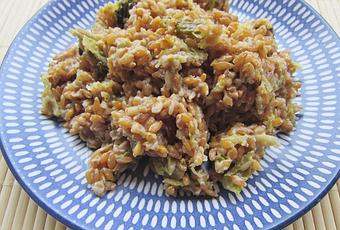 Premier essai pour cuisiner le petit épeautre en grains : cette céréale ressemble au blé, mais a un goût plus typé, avec un arôme de noisette, qui donne une saveur intéressante au plat. Le seul hic, c'est qu'il ne faut pas être pressé quand on cuisine du petit épeautre : il faut compter 45 min de cuisson... Mais cela vaut vraiment la peine, on peut transformer ainsi les plats à base de riz : cuisson à la créole pour faire des salades ou en risotto comme ici. La préparation reste la même que pour du riz, la cuisson est simplement plus longue et nécessite plus de bouillon. Vous pouvez ensuite ajouter la garniture de votre choix avec des petits légumes préalablement cuits ou le servir nature, avec juste un peu de fromage râpé. Plutôt que du mascarpone ou de la crème fraîche, j'ai ajouté de la mayonnaise à la fin pour donner de l'onctuosité au plat : j'avais vu sur plusieurs blogs que l'on pouvait aussi cuisiner la mayonnaise dans un plat chaud (après tout, pourquoi pas ? j'ai aussi testé dans une quiche, dont vous aurez bientôt la recette).