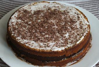 Une fois les cakes froids, les étêter (enlever la partie bombée), puis couper chaque cake en deux dans le sens de l’épaisseur. Commencer par la couche vanille à tartiner de la moitié de la crème chocolat avant de mettre l’une des couches au chocolat. Retartiner de chocolat et finir avec la couche vanille. Recouvrir enfin cette dernière du glaçage blanc. Répartir les vermicelles au chocolat ou râper un peu d’une tablette de chocolat sur ce glaçage.