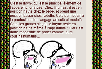 Les humains ont subi lors de leur évolution de primates une modification dont on retrouve encore des traces » fossiles » dans nos nouveaux nés ! Que se passe-t-il du bébé jusqu'à l'adulte ? La réponse est l'une des histoires les plus remarquables sur la croissance de l'être humain : jusqu'à l'âge d'un an et demi ou deux ans la position du larynx de l'enfant demeure haute dans le cou, similaire à celle de n'importe quel mammifère. Puis vers deux ans le larynx commence à descendre dans le cou. Cette descente va modifier spectaculairement la manière dont l'enfant respire, avale et émet des sons. Chez l'adulte cette descente va au niveau des vertèbres cervicales 4 à 7. L'épiglotte ne peut plus atteindre le voile du palais et ne peut donc plus s'engager dans le fond de la cavité nasale pour séparer les voies de la déglutition des voies de la respiration. Passées les premières années de l'existence, les voies digestives et respiratoires de l'être humain se croisent au-dessus du larynx . Ce croisement peut avoir des conséquences malheureuses puisqu’on ne peut plus respirer et boire en même temps sans "avaler de travers». En revanche ,la descente du larynx produit une conformation anatomique d'une valeur extrêmement positive : une chambre pharyngale très développée au- dessus des cordes vocales et très modulable en émission phonetique