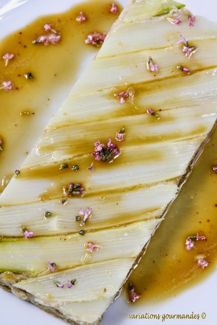 Le gâteau aux saveurs de noisettes et d'amandes accompagne divinement bien les asperges, une vinaigrette douce parfumée à la fleur de thym, venant relever l'ensemble.