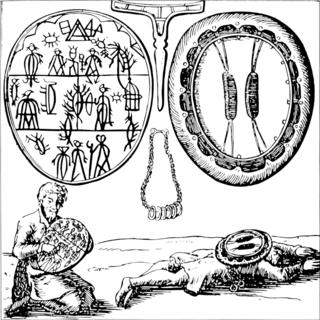 Le tambour- en sâme goavddis comportait des accessoires un marteau en forme de T, taillé en os de renne, ainsi qu'une breloque fixée à la peau du tambour, que l'on agitait pour la prédiction et que l'on nomme généralement en Laponie finlandaise arpa (" sort ").