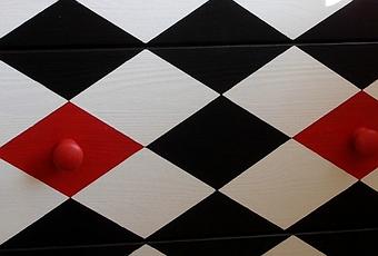 Autre petite astuce/// on peint les tiroirs dans leur ensemble avec la peinture la plus clair (le blanc pour moi) et ensuite on fait les masquage au Scotch pour les losanges rouges, puis les noirs.