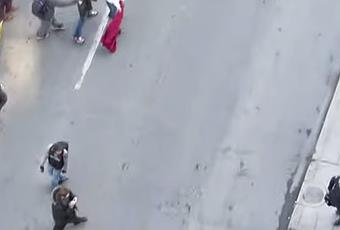 Ce que j'ignorais à ce moment-là (et le SPVM aussi, eux qui ont récemment pris l'habitude de frapper les gens avec des caméras pour éviter de se faire filmer, ceci inclus quelques journalistes d'ailleurs), ce que j'ignorais, donc, c'était que quelqu'un, sur un toit, filmait la scène. J'ai donc pu voir a posteriori mes réactions et mon déplacement face à l'affrontement... arrêt sur images: