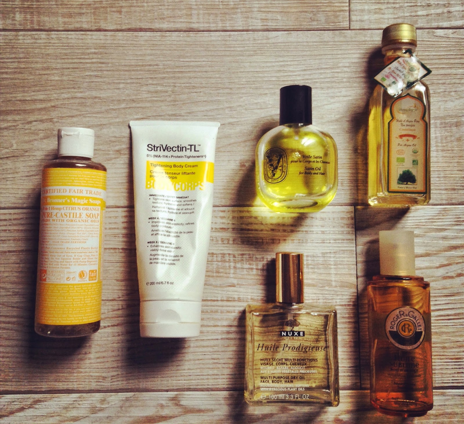 L'hiver laisse des traces sur le corps entre les excès de nourriture et d'alcool et on se retrouve rapidement avec un plis au ventre et des petites vaguelettes de cellulite sur les fesses et cuisses. Je sais ce n'est pas glamour mais ne nous voilons pas la face, peu importe la corpulence féminine, ces problématiques sont belles et bien présentes. Alors pour y remédier, j'ai trouvé cette crème à la texture épaisse mais qui s'absorbe bien qui va redessiner la silhouette. Je l'applique matin et/ou soir principalement sur la culotte de cheval et le ventre pour lisser ma peau. La formule comprend des algues pour son effet galbant et des ingrédients booster de micro-circulation dont la caféine pour son effet anti-cellulite. Après la douche - les huiles : J'ai une véritable passion pour les huiles sèches pour le corps. Leur utilisation double pour le corps et les cheveux, rendent ce produit indispensable aux femmes dès que les beaux jours apparaissent.Voile Satin Art du Soin Corps DIPTYQUE en vente sur diptyqueparis.com Une huile sèche parfumée au jasmin et à l'ylang-ylang qui satine, apaise et embellit la peau au sortir de la douche. Enrichie en huile d'avocat et en vitamines A, B et E, elle hydrate, régénère la peau et les cheveux et les protège des agressions extérieures. Huile Prodigieuse NUXE en vente en parapharmacie et sur nuxe.comTellement célèbre qu'on ne la présente plus. Elle hydrate à merveille la peau et les cheveux et laisse un subtil parfum qui est propre à la marque. Nuxe en a même fait un parfum sorti l'été dernier. Huile sublime Bois d'orange ROGER & GALLET en vente en parapharmacie En grande fan des fragrances autour des agrumes et leurs fleurs, cette huile sèche sent très bon l'orange avec un fond boisé. A une époque elle m'avait un peu asséchée la peau mais je n'avais pu me résoudre à en racheter et m'en tartiner dès que possible. Depuis plus aucun souci et j'alterne son utilisation avec celle de Nuxe et diptyque. Huile d'argan bio - ramenée du Maroc par ma choupette Basma L'argan et plus particulièrement son huile à destination cosmétique regorge de propriétés hydratantes, antioxydantes et régénératrices. Elle agit contre le dessèchement et le vieillissement de la peau en restaurant le film hydrolipidique. Elle peut également traiter les irritations cutanées comme l'acné, l'eczéma, les gerçures, les brûlures, les coups de soleil... Je l'applique avec quelques gouttes d'huiles essentielles de mandarine sur ma peau pour bien l'hydrater et pour éliminer toute imperfection cutanée liée au changement hormonal. Sur cheveux, je l'applique pur sur les longueurs pour restaurer la sécheresse due aux excès de colorations. Application après application, mes cheveux deviennent plus forts et gainés. Et vous quelle est votre routine soin corps pour vous remettre d'aplomb avant l'été?Beautez-vous bien :)