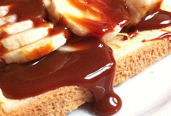 Ensuite, coupez une banane pas trop mûre en fines tranches. Disposez-les sur votre tartine, et terminez par arroser généreusement de confiture de lait. Moi, j’avais de la cajeta Coronado –un pur délice 100% mexicain, au lait de chèvre– mais vous pouvez aussi acheter du dulce de leche argentin, un pot de confiture de lait française, la réaliser vous-même à partir de lait concentré sucré, ou encore utiliser un caramel.