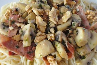 Observation : le fumé des lamelles de viande, les champignons encore un peu croquant, la sauce persillée, encore un peu de croquant avec les bouts de noix ... ce plat de pâte est une farandole de saveur !!!!