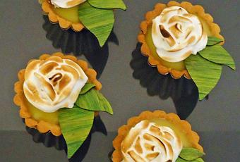 Ces tartelettes fleuries ont des airs de printemps. La croûte est faite d'un sablé breton garnis d'ne gelée ananas et d'un crémeux tropical passion-ananas. La déco est une rose en meringue grillée avec trois feuilles en chocolat noir coloré.