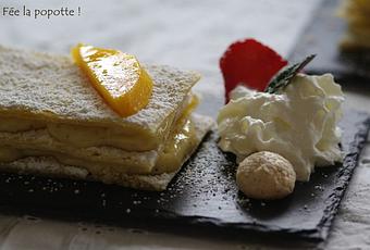 Monter les mille-feuille en intercalant les rectangles feuilletés et la crème aux fruits. Saupoudrer de sucre glace.