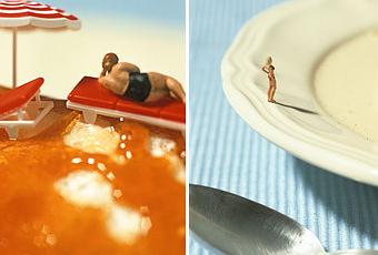 Si vous êtes gourmand, vous avez sûrement déjà imaginé, un jour, plonger dans une mousse au chocolat ou danser sur de la chantilly… Et bien Akiko Ida et Pierre Javelle, un couple d’artistes franco-japonais, transforment ces rêves en réalité avec une série de photographies : Minimiam ! Amoureux de la gastronomie à l’imagination fertile, ils créent un univers culinaire où des petites figurines miniatures vaquent à leurs occupations quotidiennes au milieu des aliments transformés en véritables paysages. De la création des petits personnages et de leurs accessoires, à l’agencement des décors, en passant par la lumière, ces 2 artistes soignent chaque détail afin de créer un fabuleux monde imaginaire, à la fois plein de réalisme et de poésie. Des cyclistes font la course sur des oeufs, tandis que des pompiers éteignent un incendie de piments rouges, et qu’un couple prend les soleil sur une plage d’île flottante. Des photos à savourer….