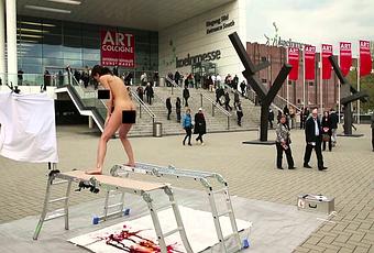 Le week end dernier à la foire d’art contemporain de Cologne (Allemagne), l’artiste suisse Milo Moiré a peint une toile en expulsant des oeufs de son vagin. Pour parvenir à un telle réalisation, elle s’est insérée des oeufs remplis de peinture dans son entrejambe avant de monter sur une petite échelle.