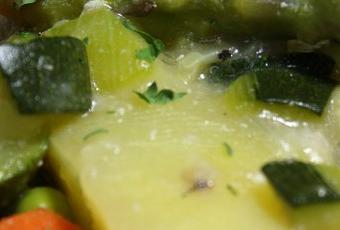 Dans un premier temps, faisons revenir la dinde préalablement émincés dans l’huile d’olive. Ajoutons l’oignon émincés. Laissons cuire quelques minutes. Réservons la viande et ajoutons les légumes préalablement coupés en morceau, taillons les queues d’asperge, pour éliminer les parties trop fibreuses, et recouvrons du bouillon de volaille. Terminons par le thym, le laurier, assaisonnons et laissons mijoter à feux doux et couvert environ 30 minutes. Réintégrons la viande pour quelques minutes.