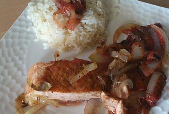 Ajoutez la compote fraise/rhubarbe, déglacez le poisson avec le vinaigre balsamique, et laissez réduire quelques instants. Ajoutez les oignons, salez et poivrez... et servez !