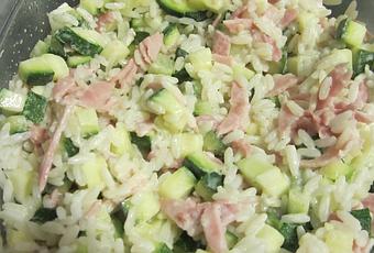 Mélanger le riz, les courgettes, le jambon et le boursin. Ajouter un peu de lait pour délier un peu le boursin.