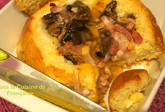 - Remplir au 2 tiers les Brioches avec les Lardons et les Champignons, verser l'Oeuf dessus et ajouter 1 CS de Crème sur chacun.