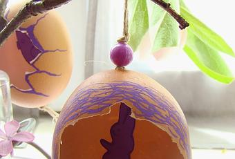 Couper un morceau de ficelle suffisamment long, pliez la en 2. Du côté de la pliure, faire un nœud de manière à former une boucle qui servira d'accroche dans les branches. Enfiler une perle et faire en second nœud pour la maintenir. Passer les 2 bouts de ficelles dans les trous pratiqués aux extrémités de l’œuf. Faire un troisième nœud (voir un quatrième si le trou est trop grand) en bas de l’œuf en veillant à ce que la ficelle soit bien tendue. Couper l'excédent de ficelle si besoin.