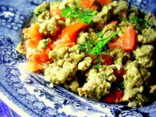 À moi aussi, il m'arrive parfois de ne pas avoir envie de cuisiner... Pour ces jours-là, heureusement, il y a les oeufs, aliment versatil permettant la confection d'un repas complet et léger en un rien de temps. Pour ces oeufs brouillés exotiques, je me suis inspirée d'une recette Pârsî vue dans le mensuel gastronomique anglais Olive de février 2008. Délicieux pour un brunch épicé ou un dîner sur le pouce...