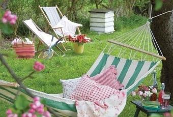 En ce week-end de Pâques, on pense toujours à vous et on vous propose une image d’un coin lecture dans un jardin. Je souhaitais vous proposer une image colorée avec un décor tout à fait printanier. A défaut d’avoir du beau temps aujourd’hui, j’ai sélectionné cette image pour que nous puissions rêver quelques instants. Je ne sais pas vous, mais je vois parfaitement dans ce jardin une belle chasse aux œufs. Il pourrait même y avoir des œufs de toutes les couleurs en décoration, suspendus aux branches des arbres… Revenons à l’image telle qu’elle est. Personnellement je suis une fan des hamacs. Alors quand on découvre une petite table sur laquelle se trouve votre boisson préférée à laquelle vous associez des oreillers et une petite couverture, c’est tout simplement le paradis sur Terre.