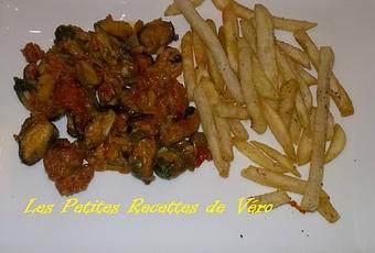Voici donc la petite histoire : j'avais des invités vendredi soir et décidé de faire des moules-frites selon une recette de ma belle-mère, les moules cuites à la marinière mais auxquelles on ajoute de la chair à saucisse et de la chapelure. J'ai donc acheté dans un hypermarché dont je tairais le nom, des moules sous vide, celles du rayon poissonerie était trop grosses à mon goût mais à ma grande déception lorsque j'ai ouvert le paquet, la moitié des moules étaient mortes (ouvertes qui ne se referment pas quand on tape légèrement dessus --> impropres à la consommation ! ) et dans le peu qui me restait, lorsque je les ai plongé dans un saladier d'eau pour les nettoyer, plus de la moitié sont remontées à la surface ! résultat il me restait à peine le 1/4 de ce que j'avais acheter ! bref autant dire que mon plat tombait à l'eau. Je décide donc de changer mon menu, et d'utiliser ma chair à saucisse pour faire des légumes farcis. Lorsque mon mari est rentré du boulot, je l'ai informé que j'avais changé de menu, mais lui avait envie de manger des moules. Je suis donc allée au petit supermarché de notre village et n'ai donc trouvé que des moules surgelées cuites.