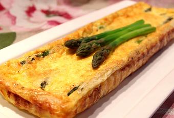 Étalez la pâte feuilletée dans un moule rectangulaire préalablement recouvert de papier sulfurisé. Disposez les asperges puis versez la migaine par-dessus. Saupoudrez de fromage râpé.