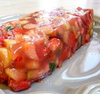 J'ai mis dans mon titre surprenante car la première que j'ai goûté cette terrine chez Dorothée , j'ai vraiment été surprise de manger de la rhubarbe crue dans un dessert. Le principe est qu'elle dégorge longtemps dans le sucre, ce qui lui permet de rendre du jus pour confectionner la gelée. Cette fois, j'ai utilisé de l'agar-agar ,poudre gélifiante obtenue à partir d'algues rouges. Je trouve que c'est plus pratique que la gélatine qui si elle ne fond pas correctement vous donne un espèce de chewing gum... vous pouvez acheter l'agar-agar dans les magasins bio mais en petites quantités car on l'utilise souvent pas 2 gr.