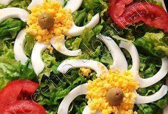 Déposer vos feuilles de salade dans l'assiette , prendre le blanc et couper des tranches les disposer comme sur la photo ecraser le jaune d'oeuf et le mettre au centre de la fleur