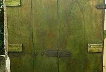 GreenBox - Meuble de rangement réalisé à partir d'une très grande caisse de transport mise à la verticale et aménagée. Porte à trois battants. Ajout de pieds, d'une étagère, d'un petit coffre à secrets avec 1 trappe sur le dessus du meuble. Ajout de renforts extérieurs en acier. Construction de 3 tiroirs sur mesure. Patine du bois avec des nuances de verts et terre de sienne. Acier brossé et ciré. Hauteur : 120 cm env. Largeur : 80 cm env. Profondeur : 35 cm env.