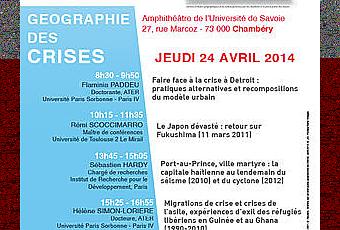 Programme de la journée "Géo'rizon : Géographie des crises" 8h30 - 9h50 : Faire face à la crise à Detroit : pratiques alternatives et recomposition du modèle urbain (Flaminia PADDEU Doctorante, ATER Université Paris Sorbonne - Paris IV) 10h15 - 11h35 : Le Japon dévasté : retour sur Fukushima (11 mars 2001) (Rémi SCOCCIMARRO Maître de conférences Université de Toulouse 2 Le Mirail) 13h45 - 15h05 : Port-au-Prince, ville-martyre : la capitale haïtienne au lendemain du séisme (2010) et du cyclone (2012) (Sébastien HARDY Chargé de recherches Institut de Recherche pour le Développement, Paris) 15h25 - 16h55 : Migrations de crise et crises de l'asile, expériences d'exil des réfugiés libériens en Guinée et au Ghana (1990-2010) (Hélène SIMON-LORIERE Docteure, ATER Université Paris Sorbonne - Paris IV) 16h55 - 17h30 : Table-ronde autour des conférenciers : Gérer les crises : l'apport des géographes