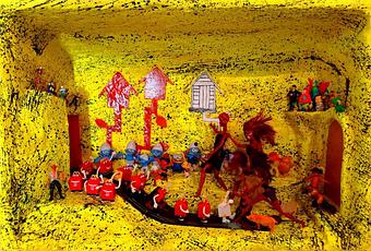Clin d’œil à l’histoire de l’art, de Poussin à David, de nombreux artistes classiques ont peint l’enlèvement des Sabines, que l’on retrouve ici avec trois poupées Barbie remaquillées dans une relecture cocasse de l’histoire. Autre objet récurrent, la maison, référence directe à notre environnement d’où proviennent la plupart de ces objets mis au rebut.