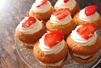 Démoulez les gâteaux de leur caissette et coupez-les en deux horizontalement. Garnissez-les de compotée de fraises et de chantilly. Recouvrez avec la seconde partie du gâteau et décorez avec le reste de chantilly à l'aide d'une poche à douille. Déposez une tranche de fraise sur le dessus avec quelques zestes de citron.