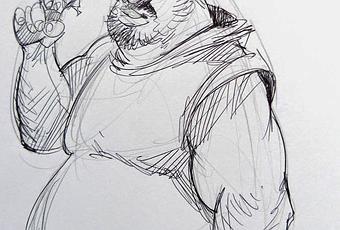 Et donc tout en discutant, le dessin de la dédicace prend forme. Avec d'abord un croquis grossier au crayon papier. Puis au stylo bille noir, le personnage commence à se dessiner. Un embonpoint certain, une barbouse mal rasée, des lunettes de soleil... et un air décontracté avec une main dans la poche alors que de l'autre il tient un pistolet.