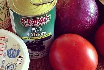 Ça prend des tomates, des concombres, de l'oignon rouge, du vinaigre de vin rouge (ou de cidre), de l'huile d'olive, du fromage fêta, des épices grecques ou de l'origan, du sel, du poivre et hop, l'affaire est ketchup!