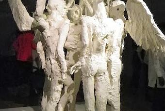 Dans le hall Basano, David Altmejd présente la Galerie du masque, une sculpture monumentale et macabre de six figures ailées en plâtre qui forment une ronde.