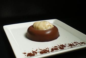 1) Faire ramollir la gélatine dans de l’eau froide. Hacher le chocolat. Dans une casserole, porter à ébullition la crème liquide. Oter la casserole du feu, verser le sucre, ajouter la gélatine essorée et mélanger. Laisser la préparation tiédir un peu, puis ajouter le chocolat et remuer pour obtenir une crème bien lisse. Verser dans des moules à savarin individuels en silicone. Faire prendre au réfrigérateur pendant 3h minimum.