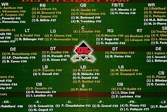 NB: Le depht chart est basé sur la liste officielle des joueurs que m'a fournis les communications du Rouge et Or. Je me suis basé sur mes connaissances de l'époque et ce que j'ai vu sur la vidéo. Donc, pour les positions ce n'est pas tout à fait exact. C'est pour vous donner une idée de la composition de l'équipe au début du programme. Les joueurs en or sont ceux qui ont été partantdans le match.