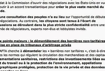 Le Traité Transatlantique est loin d'être signé ! MOBILISONS-NOUS Pourquoi ce silence dans les « Grands médias » (presse, tv ,,,) ? Ils n'en parlent pas, ne font pas leur travail d'information ! - Un collectif unitaire « StopTAFTA » a été crée en France. - En France des collectifs locaux se montent (comme cela a été le cas pour lutter contre les gaz de schiste . il y a plus de 250 collectifs « gaz de schiste non merci ») - En France des conférences sont programmées pour avertir les français des dangers du traité transatlantique en cours de négociation. ---> http://stoptafta.wordpress.com/conferences-reunions-des-collectifs-locaux/ - Les régions Ile de France et PACA, Limousin, Picardie, Bretagne ... les départements Seine Saint-Denis, Tarn … les villes Besançon, Niort, La Grande Synthe, Saint-Denis, Crévoux, Briançon, Sevran, se sont déclarées « Hors Tafta » et le région Auvergne « contre le Traité » - Signez la pétition « PROTÉGEONS NOS COMMUNES, DÉPARTEMENTS, RÉGIONS … DÉCLARONS LES HORS TAFTA ! » ---> http://stoptafta.wordpress.com/2014/03/14/declarons-nos-communes-hors-tafta-non-aux-accords-de-libre-echange-entre-les-usa-et-lue/ Toutes les informations et l’actualité à ce sujet sur —> http://stoptafta.wordpress.com/