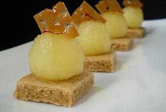 5) Présentation : Disposer sur les petits carrés de spéculos les billes de pommes et ajouter un pistil de safran et un petit morceau de tuile au miel.