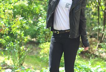 Pour le côté rétro je porte le tee-shirt rentré dans mon jeans H&M et mon Perfecto cuir Zadig & Voltaire. Un chignon haut, une touche de rouge sur les lèvres et le tour est joué.