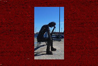 ZINKGLOBAL représente un homme (trois mètres de haut quand même, sacré gaillard !) assis en position de penseur sur une clé. L’homme est constitué de déchets métalliques recyclés, aussi bien des pièces de voitures que des éléments électriques.