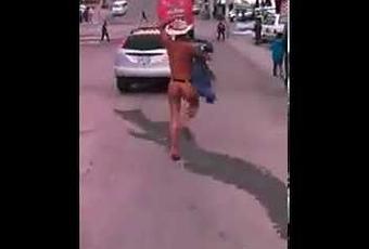 Dans une rue d’une ville mexicaine, des passants ont filmé une scène très drôle et assez rare : un homme a surpris sa femme au lit avec son amant, ce dernier prend la fuite complètement nu tandis que le cocu le poursuit en l’insultant de tous les noms.