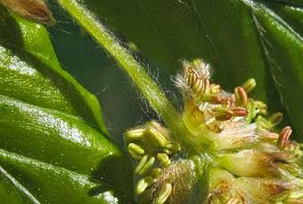 Le Hêtre (Fagus sylvatica) est un arbre monoïque : fleurs mâles en chatons globuleux pendant à la base des pousses de l'année et fleurs femelles verdâtres terminales, souvent groupées par deux.
