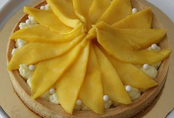 14- Garnir la tarte de crème chiboust et recouvrir de mangue