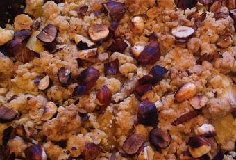 Concasser les noisettes et les faire revenir à sec à la poêle jusqu’à ce qu’elles prennent une belle couleur brune. Les répartir sur le crumble à la sortie du four.